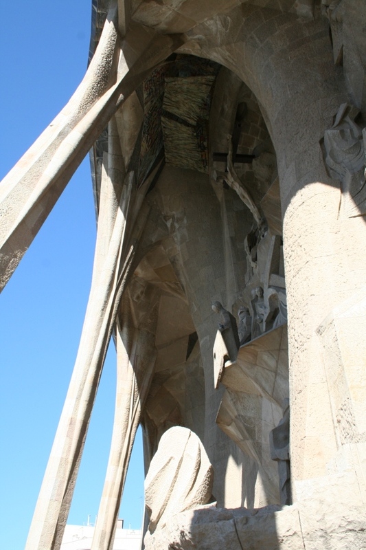 Façade à l'Ouest, consacrée à la Passion et la mort du Christ Les piliers évoquent des troncs d'arbre, renforçant la décoration naturaliste : avec nuages et stalactites, ils composent une véritable forêt de pierre