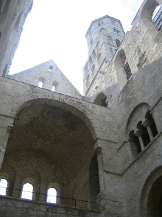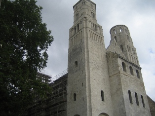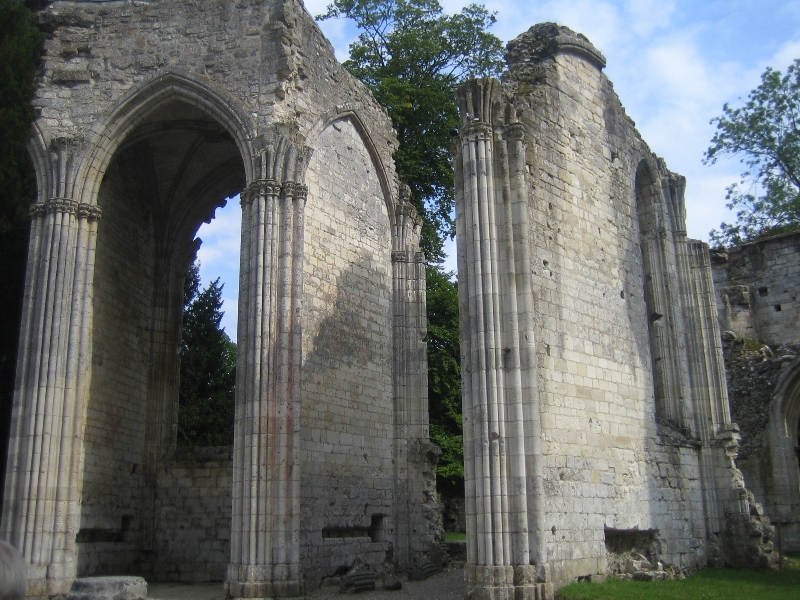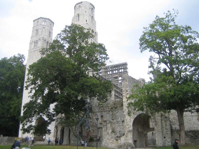 | L'abbé Robert de Jumièges dit Champart fait reconstruire le monastère (1040–1052). Le 1er juillet 1067, l'archevêque de Rouen, le bienheureux Maurille, consacre solennellement la grande église abbatiale de Notre-Dame de Jumièges, en présence du duc de Normandie Guillaume le Conquérant et de nombreux prélats, dont tous les évêques de Normandie. | ||