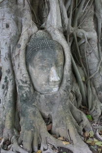 Une tête enserrée dans les racines d'un arbre.