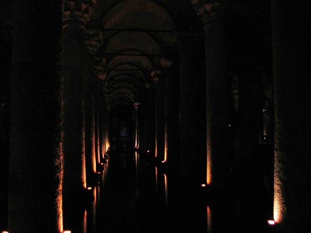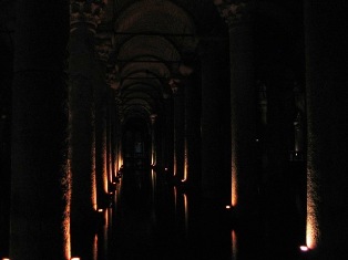 La citerne Yerebatan Sarayi : le palais englouti. Agrandie sous Justinien (527-565), elle fournit 80000 m3 d'eau pour l'irrigation